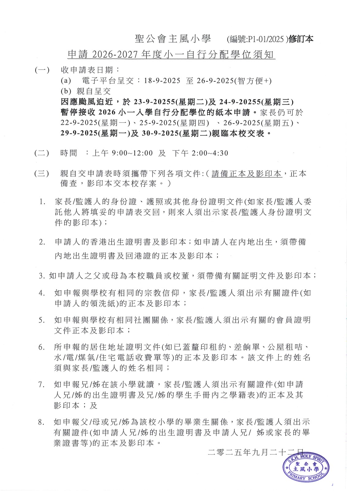 申請2026-2027年度小一「自行分配學位」注意事項 (22-09-25更新)