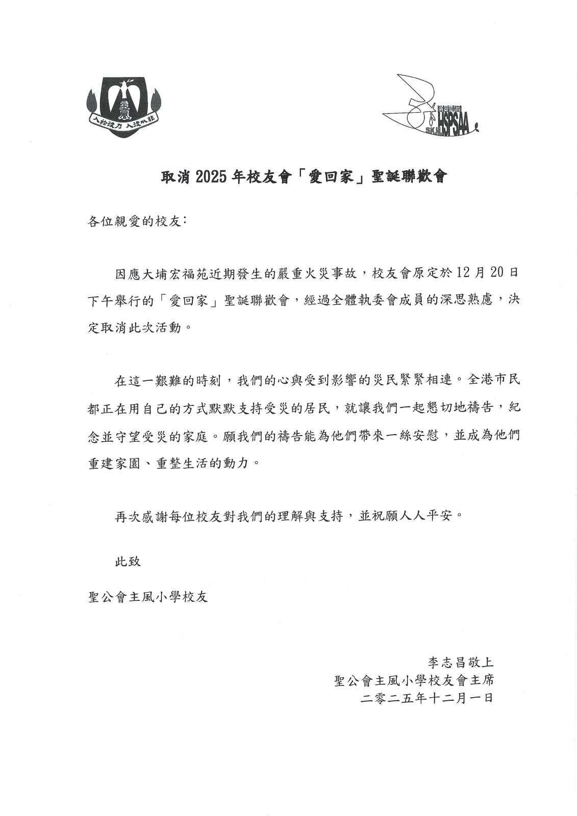 有關 2025年校友會「愛回家」聖誕聯歡會取消 事宜