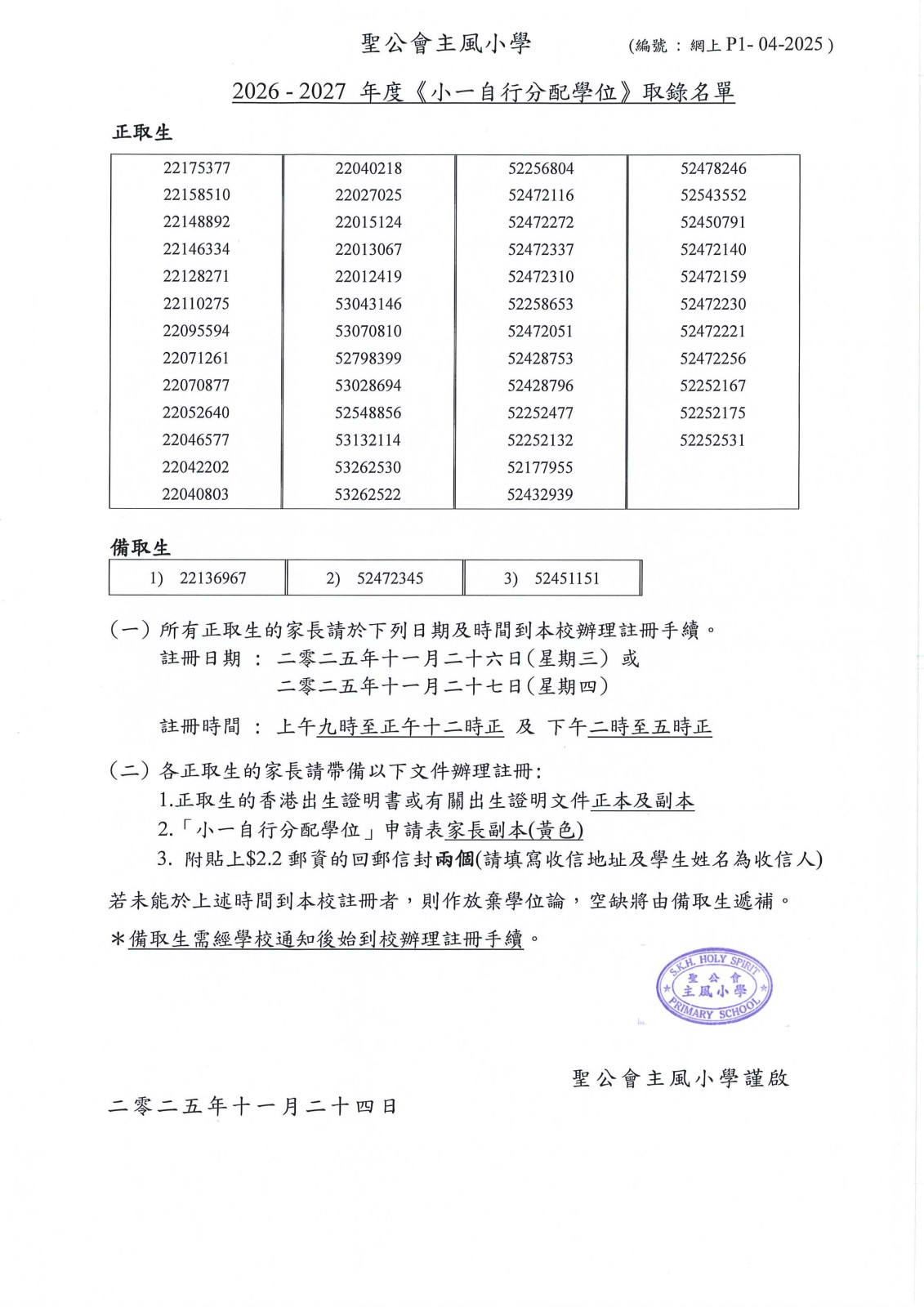 2026 - 2027 年度《小一自行分配學位》取錄名單