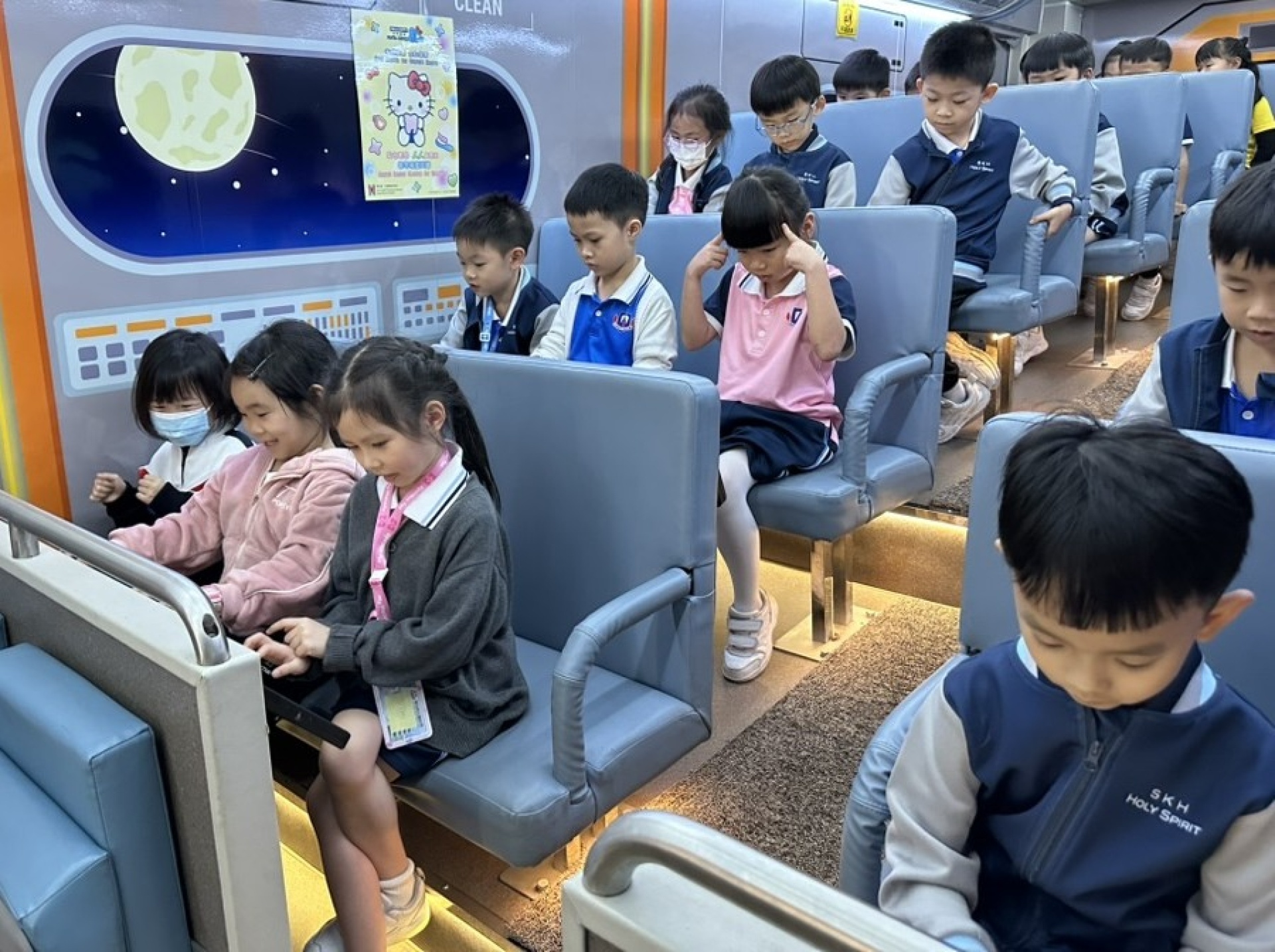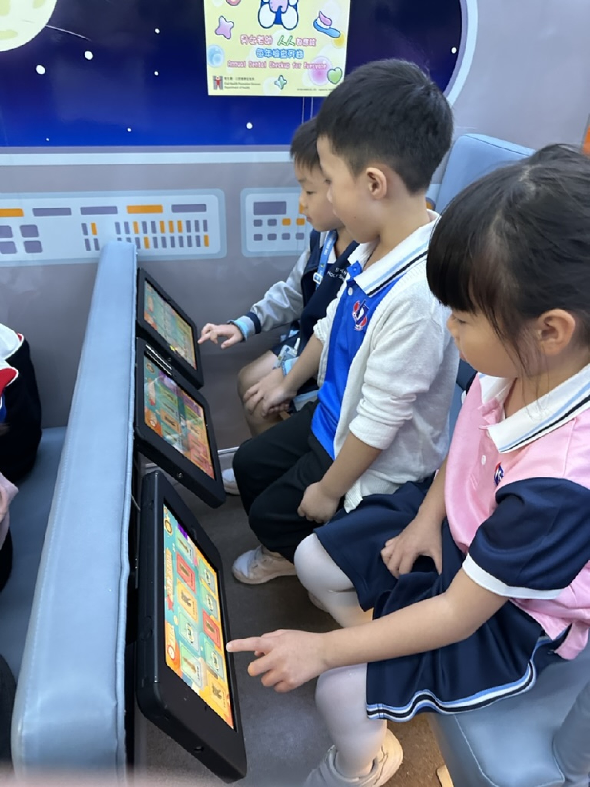 10月23日本校一年級學生於科學課堂參與「陽光笑容流動教室」。學生參觀口腔健康教育巴士,透過動畫、遊戲等活動,認識口腔健康的知識及提升他們掌握口腔護理技巧的能力。