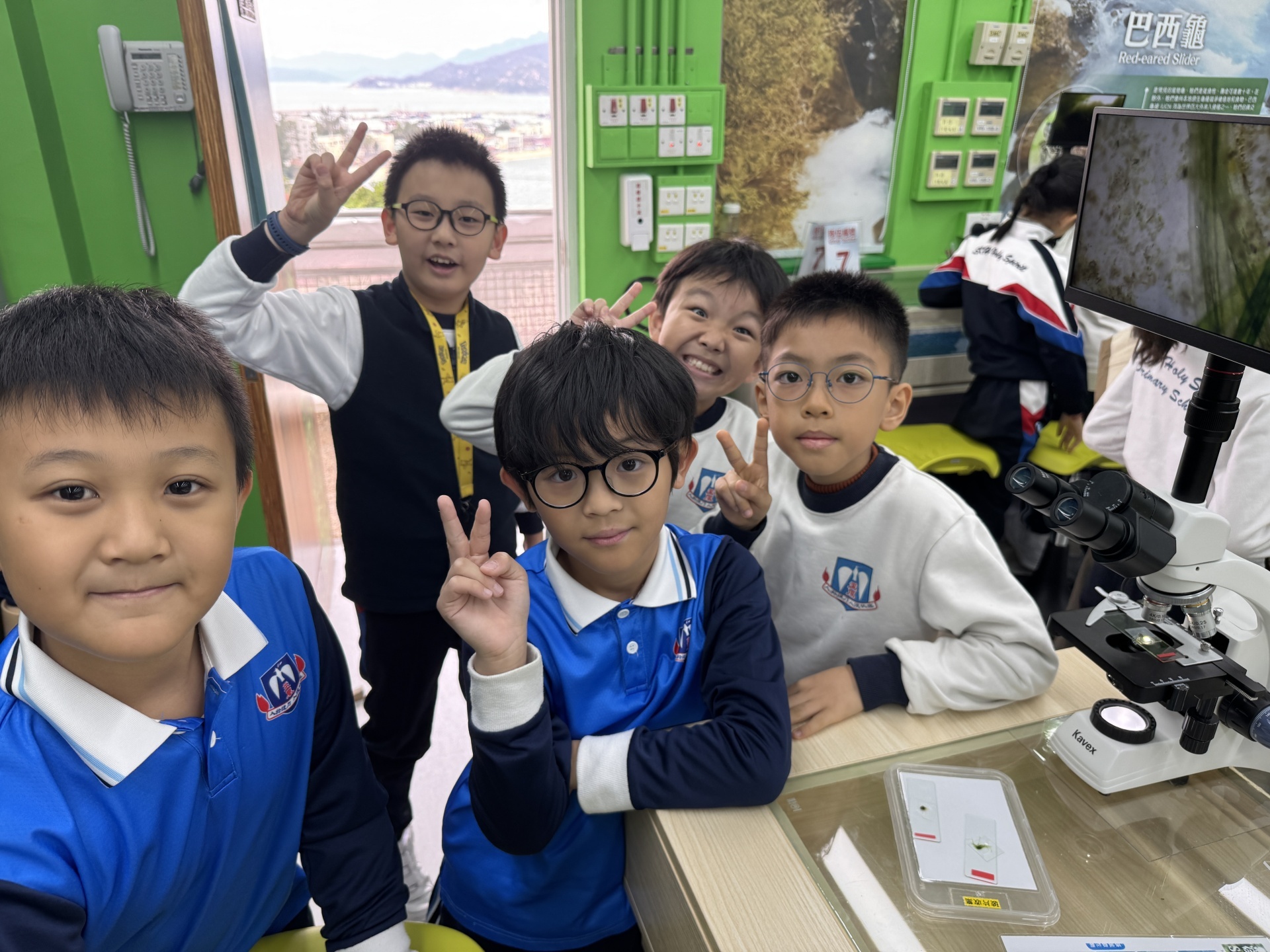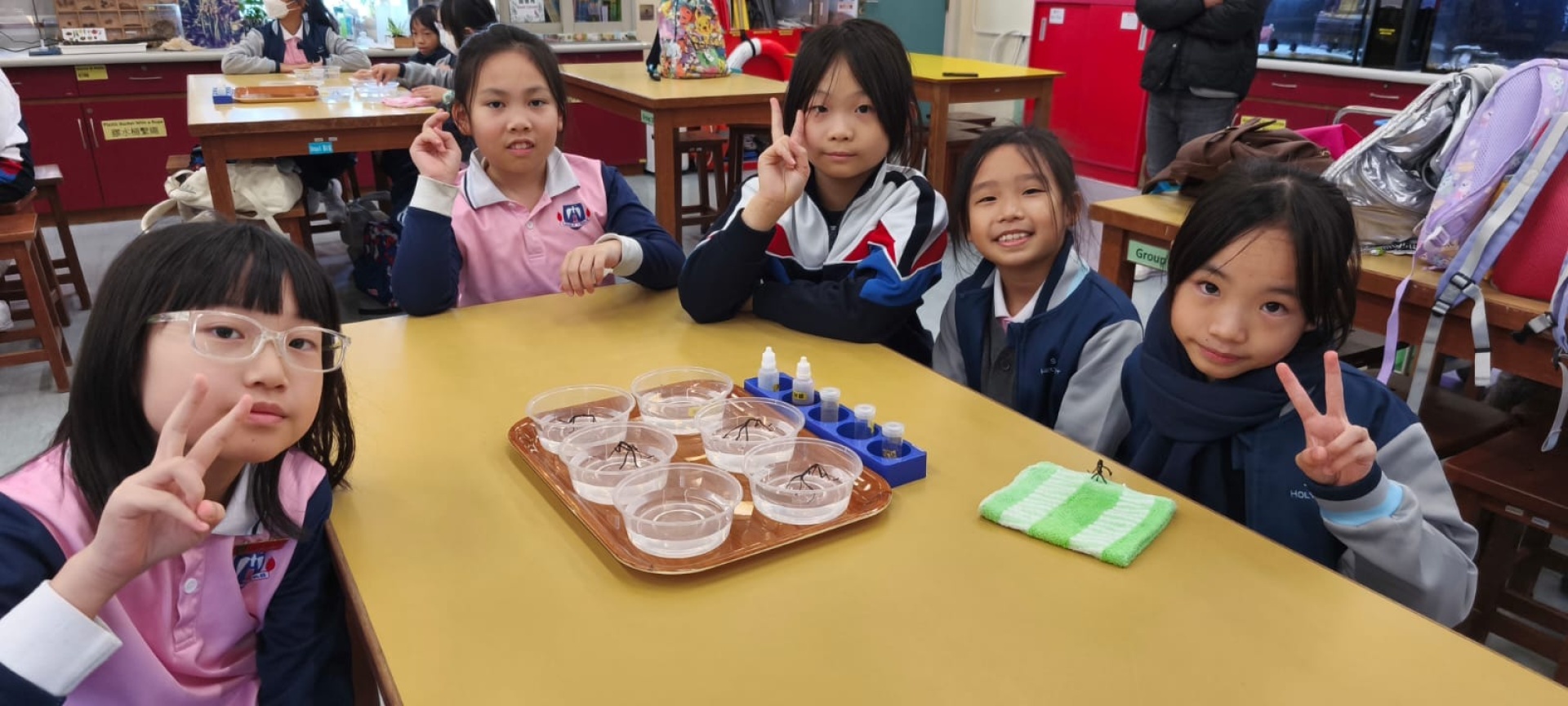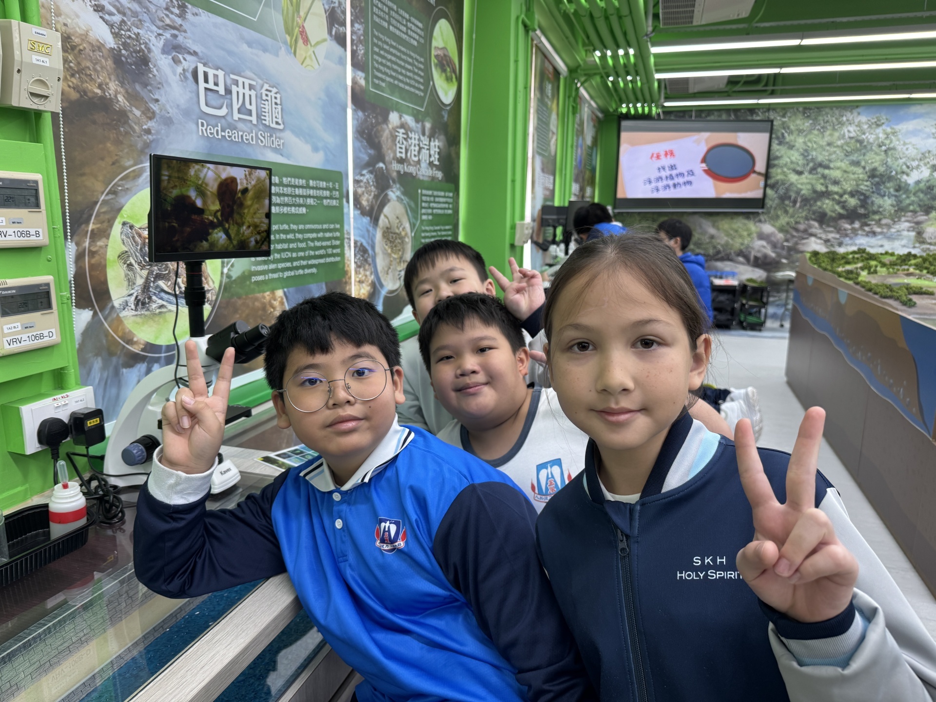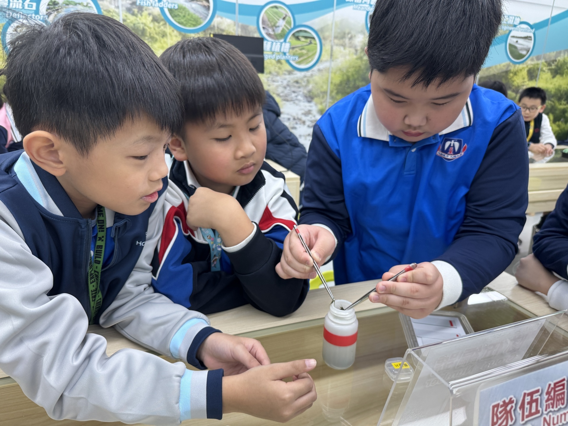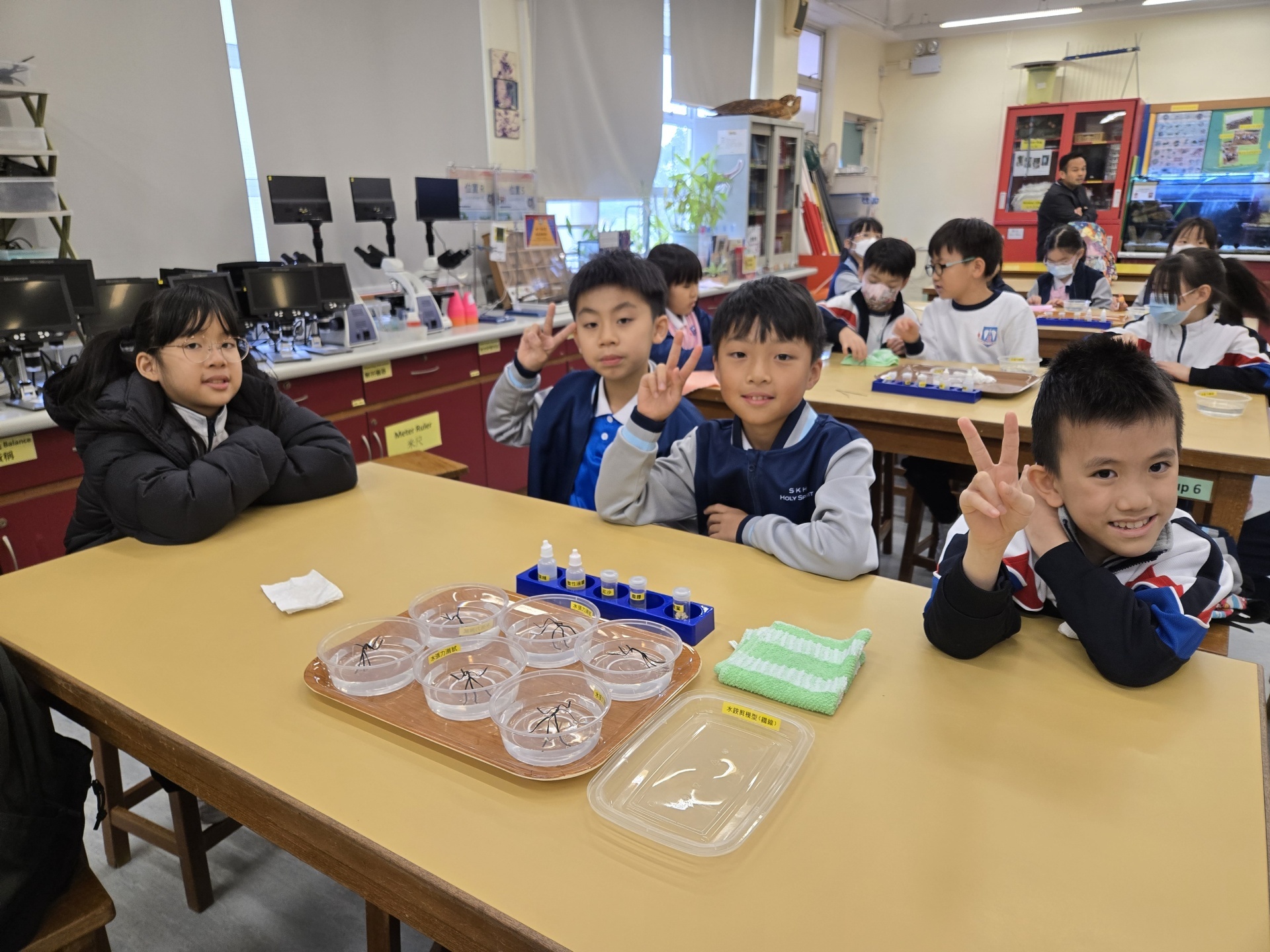 2025年11月19日四年級進行人文科及科學科戶外學習日,學生前往長洲明愛陳震夏郊野學園,進行不同實驗。學生透過活動A:製作水鉸剪,認識水面張力,了解到洗潔精會破壞水面張力。學生在活動B:水質調查,了解水含有不同的物質,而這些物質的數量會影響到水的品質。最後,學生在活動C:使用顯微鏡,觀察水中的微生物和浮游植物。活動過程中學生積極投入,踴躍參與活動及回答問題,透過觀察水中微生物、檢測水中的污染度,及了解污染河道的成因,學習如何保護生態環境,為地球出一分力。
