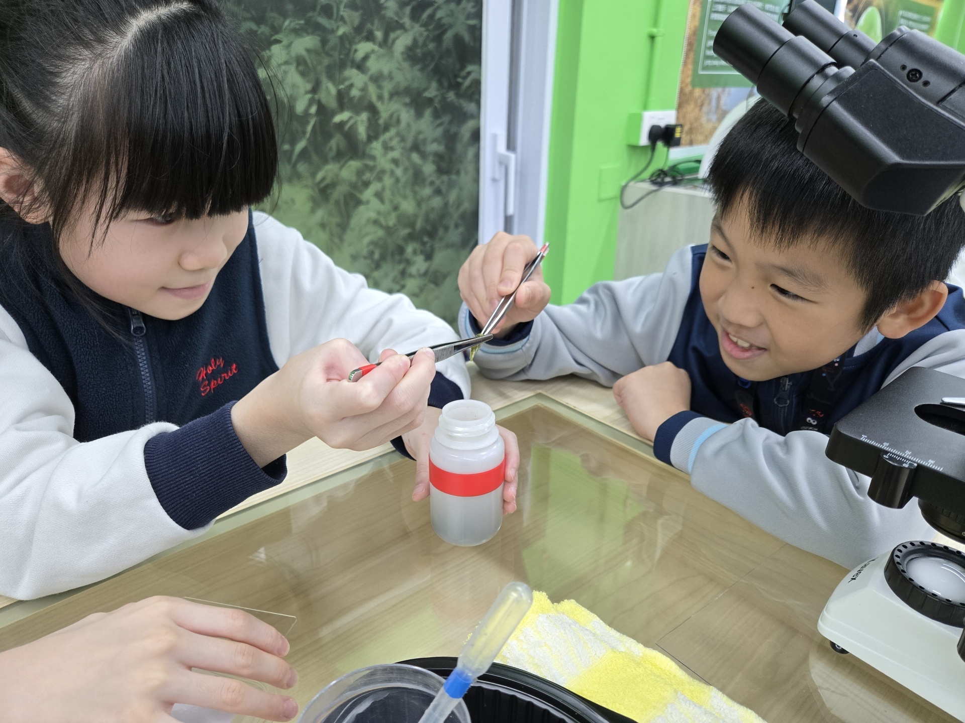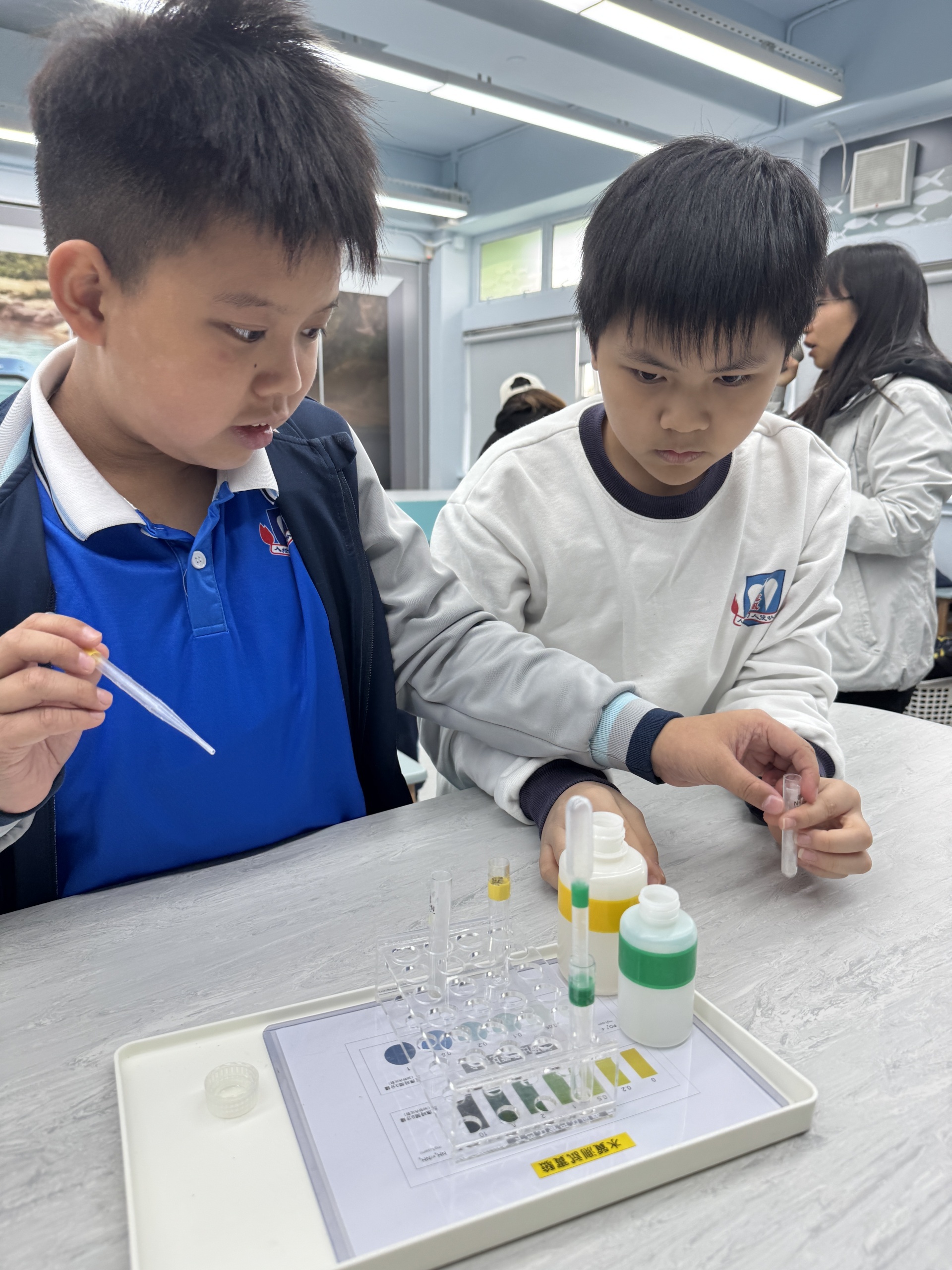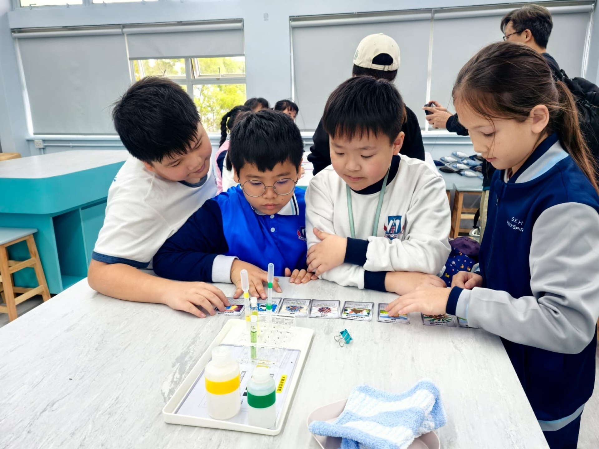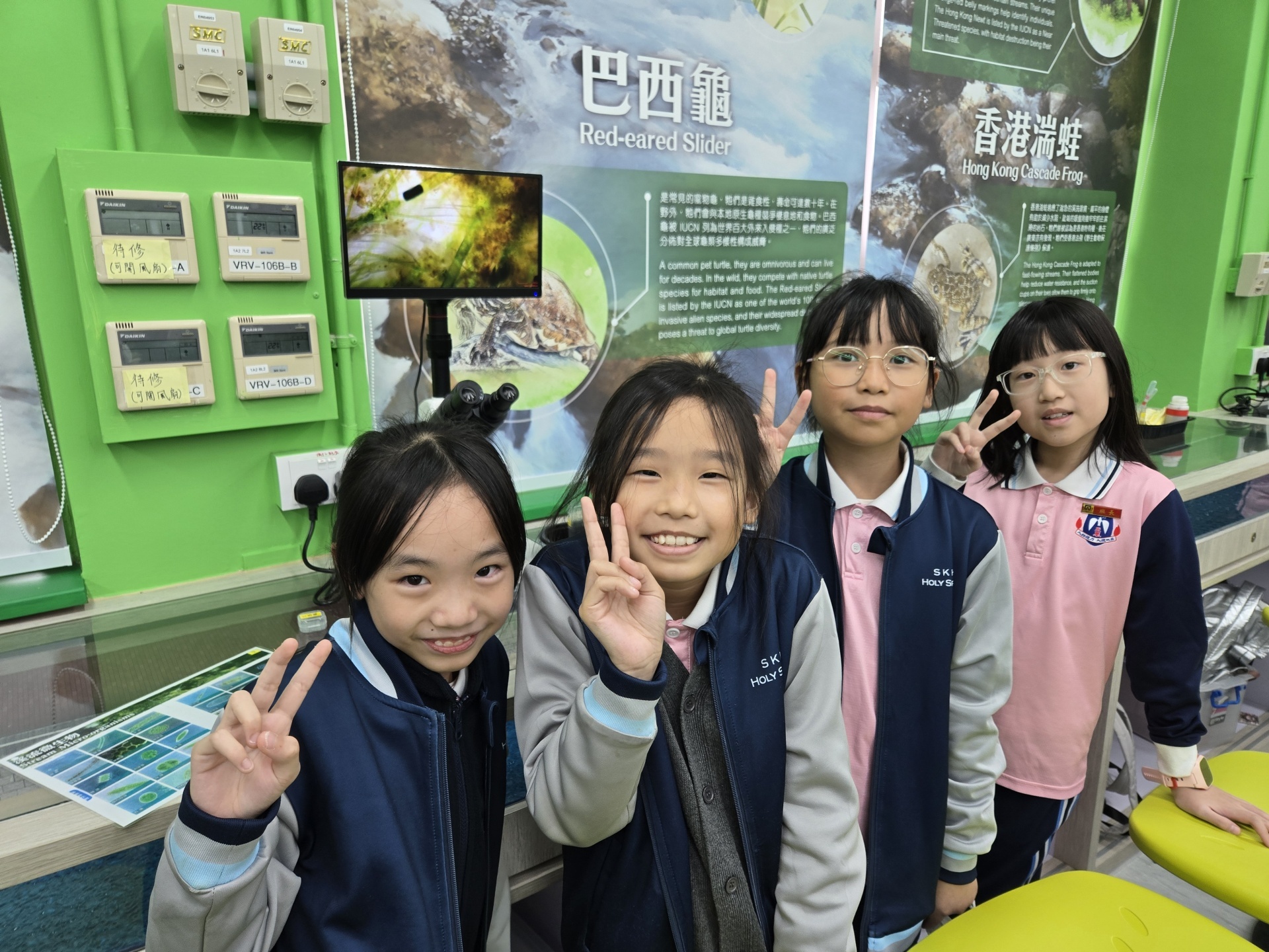 2025年11月19日四年級進行人文科及科學科戶外學習日,學生前往長洲明愛陳震夏郊野學園,進行不同實驗。學生透過活動A:製作水鉸剪,認識水面張力,了解到洗潔精會破壞水面張力。學生在活動B:水質調查,了解水含有不同的物質,而這些物質的數量會影響到水的品質。最後,學生在活動C:使用顯微鏡,觀察水中的微生物和浮游植物。活動過程中學生積極投入,踴躍參與活動及回答問題,透過觀察水中微生物、檢測水中的污染度,及了解污染河道的成因,學習如何保護生態環境,為地球出一分力。